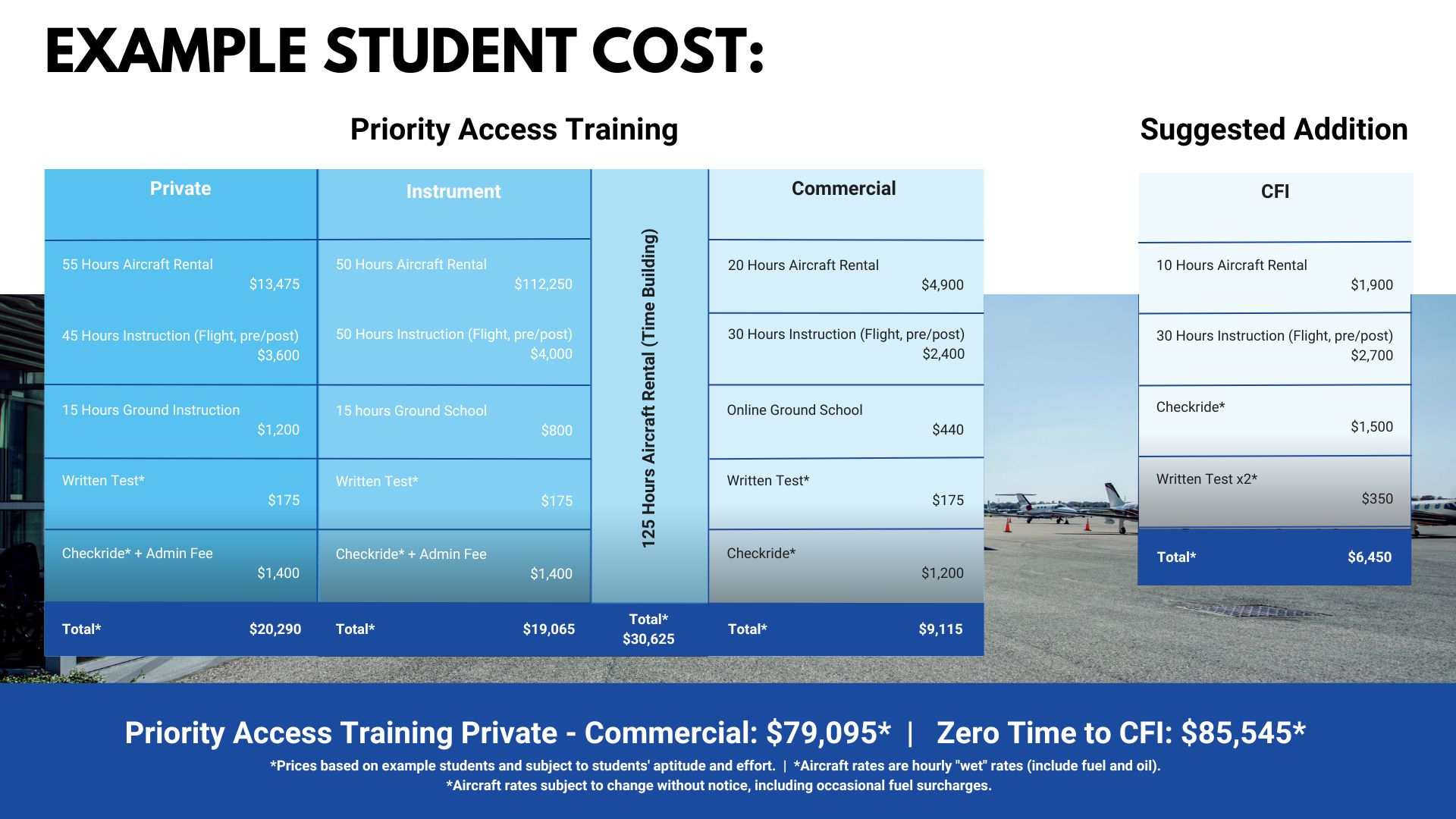 *Prices based on example students and subject to students' aptitude and effort | *Rates based on platinum rates received with $10,000 deposit | *Aircraft rates are hourly "wet" rates (include fuel and oil) | *Aircraft rates subject to change without notice, including occasional fuel surcharges